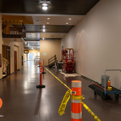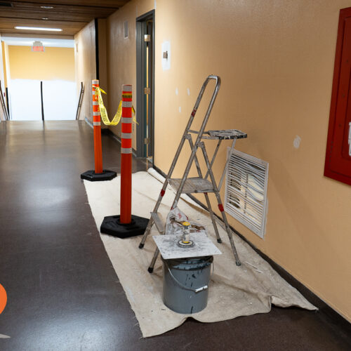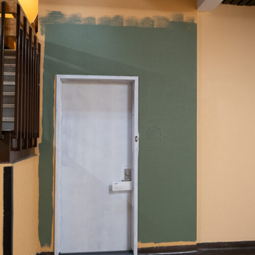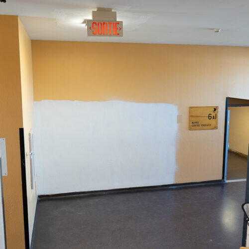 Depuis quelques semaines, le personnel de l’habitation d’ArcelorMittal a commencé à repeinturer les différentes sections du mur-écran : les murs, les cages d’escaliers et les portes.