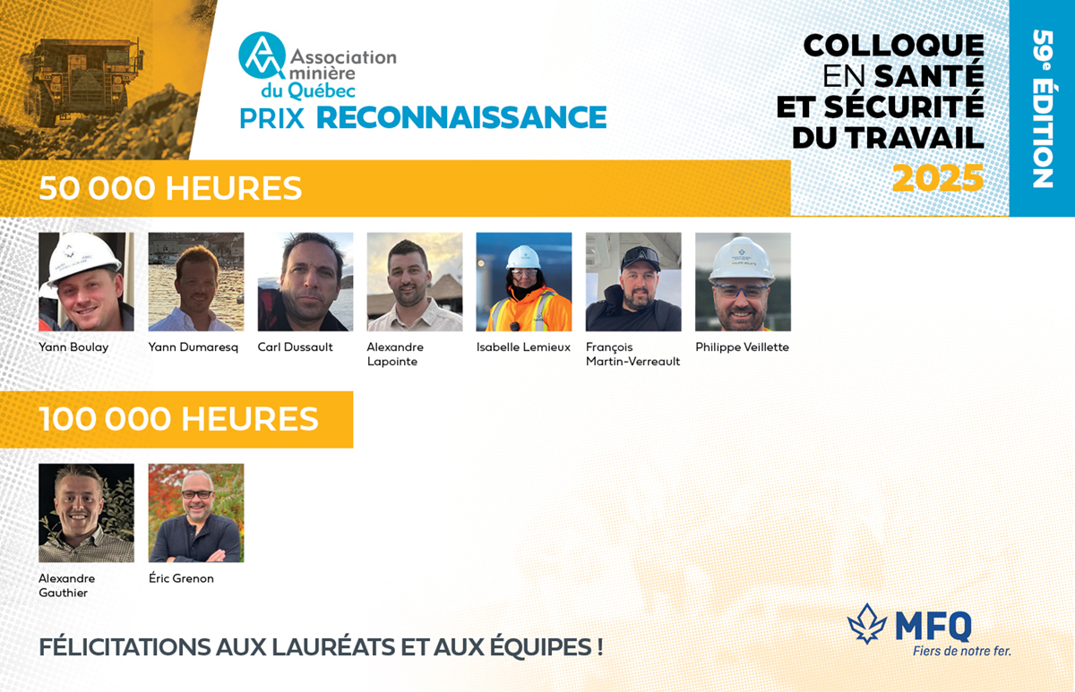 « Les prix ont été remis en reconnaissance d’un engagement exceptionnel envers la santé et la sécurité au travail, basé sur le nombre d’heures travaillées sans accident. Cet événement offre à l’industrie une occasion privilégiée de célébrer ses nombreuses réussites en santé et sécurité du travail avec des chiffres impressionnants qui en témoignent. Les travailleurs miniers démontrent clairement que la santé et la sécurité dans les mines reposent sur une volonté commune de toujours faire mieux et d’évoluer dans un cadre de travail toujours plus sécuritaire », a déclaré Emmanuelle Toussaint, présidente-directrice générale de l’AMQ, dans un communiqué.