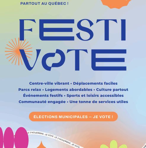 Par Élizabeth Séguin La radio de Fermont Afin d’encourager les jeunes de 18 à 34 ans à aller voter le 2 novembre prochain, l’Union des municipalités du Québec (UMQ) a lancé le « Festi-Vote ». La campagne publicitaire s’inspire des festivals populaires et fait de la journée du scrutin un événement incontournable. La présidente de […]